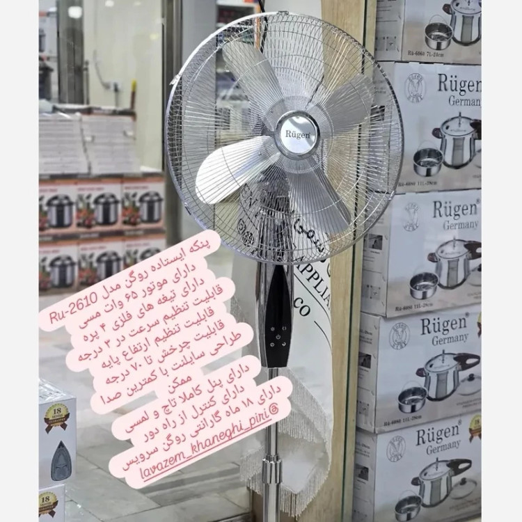 پنکه ایستاده روگن مدل Ru-2610 قابلیت تنظیم ارتفاع : دارد قابلیت تنظیم تایمر : دارد کنترل از راه دور : دارد قابلیت تنظیم سرعت : دارد در 3 حالت قابلیت چرخ به دور خود : دارد تا 70 درجه توان موتور : 65 وات با سیم پیچ مسی نوع و جنس پروانه : دارای پروانه فلزی 4 پره دارای پنل دیجیتالی و لمسی