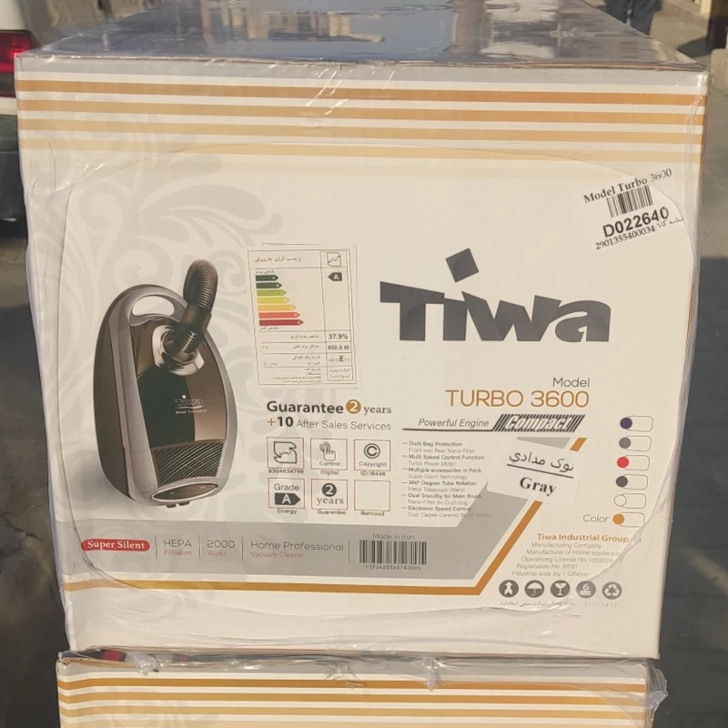 جارو برقی تیوا مدل 3600 ساخته شده از بهترین مواد پلاستیک نو موتورAEGساخت اروپا دارای علامت استاندارد ملی با لیبل انرژیA موتور200وات واقعی کابل 6متری مجهز به سیم جمع کن خودکار صفحه نمایشی نشانگر پر شدن کیسه در نمایشگر لوازم:لوله خرطومی 2متری،لوله تلسکوپی استیل ،پارویی مخصوص موکت و فرش ،گوشه گیر،گرد گیر مویی،دفترچه راهنما✅ «زیر قیمت کل بازار»