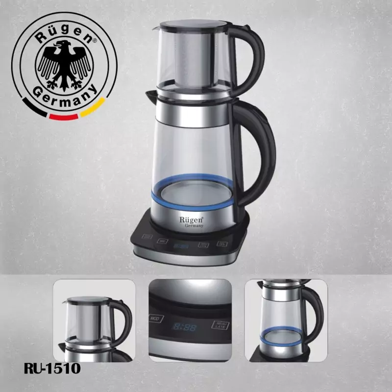 چای ساز روگن RU-1510 ساخت برند روگن که یک برند معروف آلمانی است و مجهز به فناوری ها و قابلیت های منحصر به فردی می باشد. به عنوان مثال یکی از بهترین و مهم ترین ویژگی های این محصول قابلیت استفاده از یک کتری می باشد. یعنی شما کاربران قادر خواهید بود از کتری این چای ساز به صورت جداگانه استفاده کنید. همچنین ظرفیت کتری برابر با 1.7 لیتر و قوری 1 لیتر می باشد. اجزای این محصول فوق العاده شامل کتری و قوری به همراه صفحه نمایش زیرین آن با صفحه نمایش لمسی و نمایشگر و کنترل دما می باشد که از طریق آن و فعال سازی سنسور نگه داشتن گرم می تواند چای را گرم نگه دارد. جدا از این کیس های منحصربفرد، از فناوری دیگری نیز استفاده می کند و آن خاموش شدن خودکار در هنگام خالی بودن کتری است. به این ترتیب هر زمان که کتری خالی باشد دستگاه به صورت خودکار یا به همین صورت خاموش می شود و به این ترتیب از بروز مشکل جلوگیری می شود. در ضمن این محصول بسیار زیبا و کاربردی که برای هر مکانی مناسب است 2200 وات تناژ مصرفی را پشتیبانی می کند. از نظر طراحی بسیار منحصر به فرد و فوق العاده است و به گونه ای ساخته شده است که چشم بیننده را به خود جلب می کند. بدنه قوری از شیشه و قوری از فولاد ضد زنگ ساخته شده است. در آخر باید بگوییم که علاوه بر تهیه چای، می توانید برای تهیه قهوه نیز از آن استفاده کنید و با آن قهوه ای بسیار خوشمزه درست کنید.