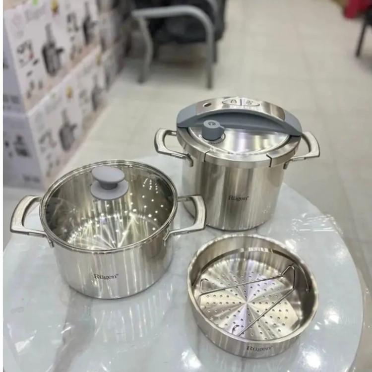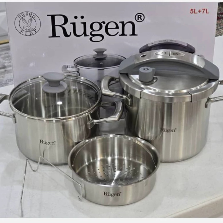 زودپز دو قلو روگن مدل Ru-6030 2 عدد دیگ با ظریف 5 و 7 لیتری دارای درب استیل و شیشه مشترک بین هم دارای درب کلیپسی نسل جدید 2 عدد سوپاپ با قابلیت تنظیم درجه فشار کفی دو لایه چدنی با قابلیت پخش دما استیل کد 304 ضد زنگ- رنگ ثابت - ضد انفجار و تضمینی دارای دسته های یک پارچه و استیل اقلام همراه 1-سبد بخارپز 2- گیره 3 -درب شیشه ای 4-درب کلیپسی 5- دیگ های آن