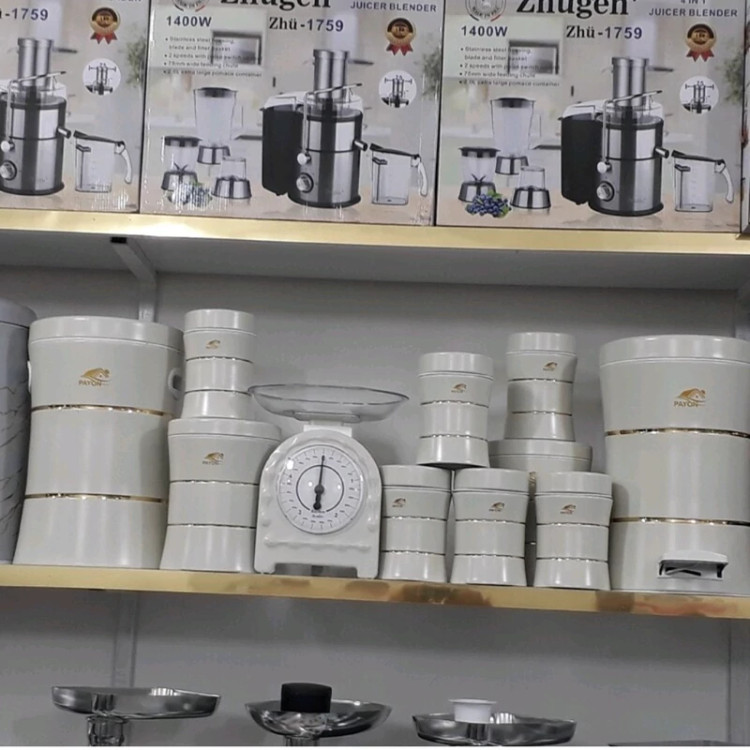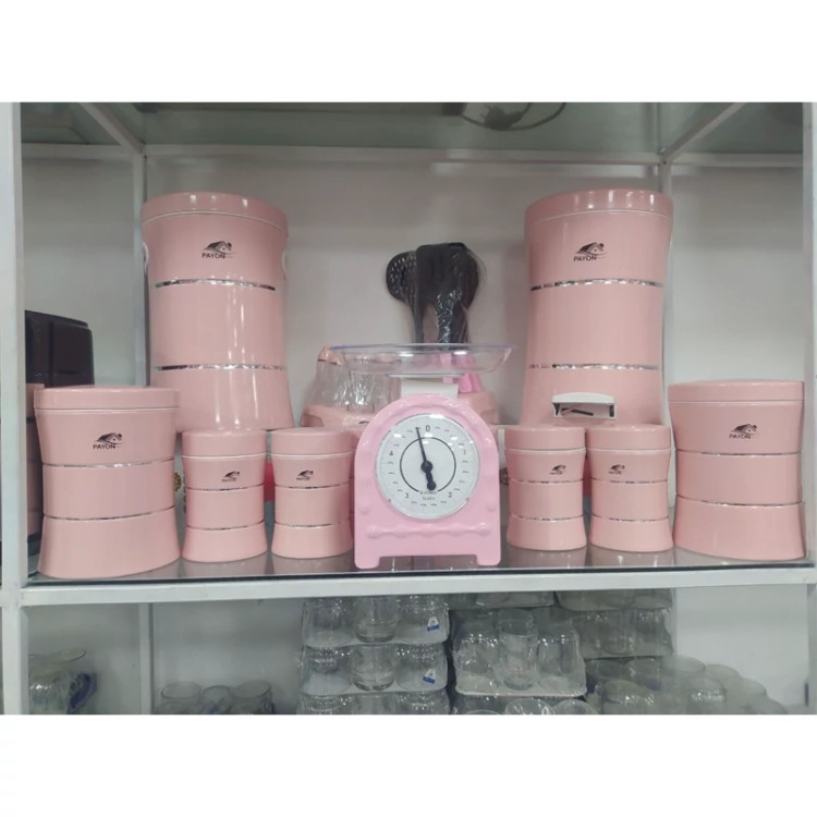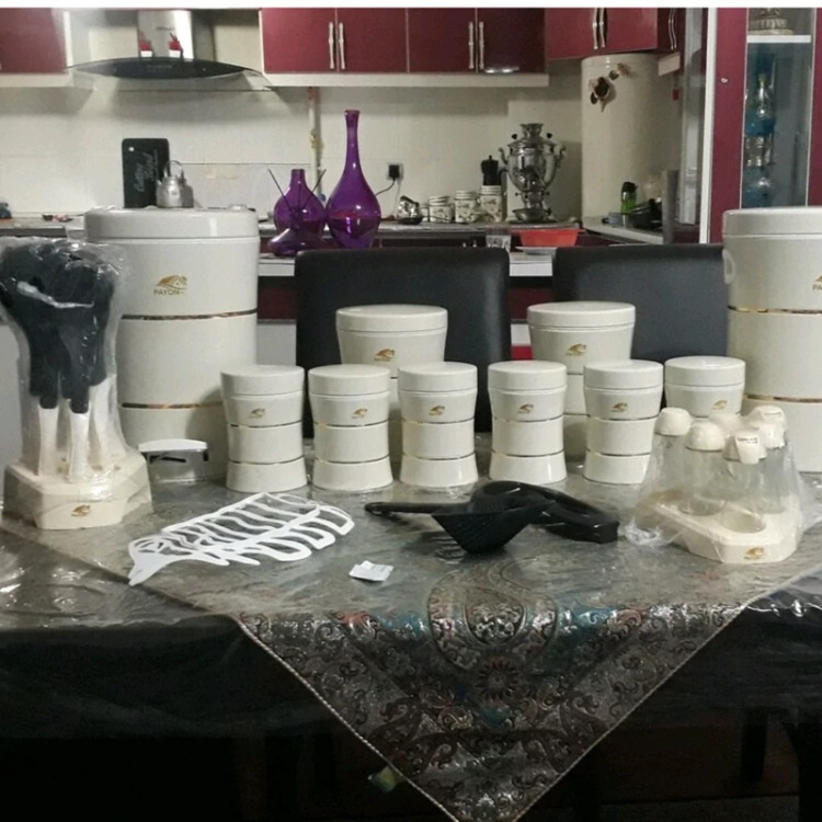 مشخصات ابعاد بستهبندی 49 × 70 × 60 سانتیمتر سایر توضیحات مشخصات ست ظرف نان و بنشن: - یک عدد ظرف نان - ابعاد ظرف نان: 17.5 × 24 × 43.5 سانتیمتر و وزن 1609 گرم - ظرف نان دارای درپوش آسان بازشو و مناسب برای نگهداری از انواع نان - 3 عدد بانکهها دارای درپوش از نوع چفتی - ابعاد هر بانکه: قطر 11.5، ارتفاع 16.5 سانتیمتر - وزن 375 گرم - کف بانکهها دارای لایهای لاستیکی برای جلوگیری از سُر خوردن از روی سطوح مختلف - بانکهها مناسب برای نگهداری از قهوه، شکر، چای، قند و... مشخصات بانکه کوچک: - تعداد: 3 عدد - ابعاد: قطر 11.5 و ارتفاع 9 سانتیمتر - وزن ظرف: 207 گرم - دارای درپوش فلزی مشخصات ظرف بانکه متوسط: - تعداد: 3 عدد - ابعاد: قطر 17.5 و ارتفاع 20 سانتیمتر - وزن: 715 گرم - دارای درپوش فلزی مشخصات ظرف حبوبات بزرگ: - تعداد: 1 عدد - ابعاد: قطر 27.5 و ارتفاع 23 سانتیمتر - وزن: 1515 گرم - دارای درپوش فلزی مشخصات ترازو: - ابعاد: قطر 22.5 و ارتفاع 30 سانتیمتر - قطر کاسهی ترازو: 22.5 سانتیمتر - وزن 650 گرم - دارای پیچ تنظیم عقربه (صفر کردن) - قابلیت جدا کردن کاسه - جنس ترکیبی از پلاستیک و فلز مشخصات ست ملاقه: دارای 6 عدد ابزار آشپزی به همراه استند - ارتفاع استند: 37.7 سانتیمتر - وزن: 443 گرم - جنس: پلاستیک مشخصات ست جای ادویه: - شامل 6 عدد جای ادویه - ارتفاع هر ظرف ادویه: 10.8 سانتیمتر - قطر دهانه: 5 سانتیمتر - وزن هر کدام: 90 گرم مشخصات ظرف برنج: - ارتفاع: 36.3 سانتیمتر - قطر سطح مقطع: 27.5 سانتیمتر - دارای قسمت جای دست - دارای پیمانه پلاستیکی - ظرفیت: 18 کیلوگرم مشخصات سطل: - ارتفاع: 42 سانتیمتر - قطر سطح مقطع: 29 سانتیمتر - دارای پدال - گنجایش: 20 لیتر - دارای دستگیره - دارای قابلیت جدا کردن سطل داخلی - دارای در فلزی مشخصات ظرف ماکارونی: - ارتفاع: 25 سانتیمتر - قطر: 11.5 سانتیمتر - وزن: 560