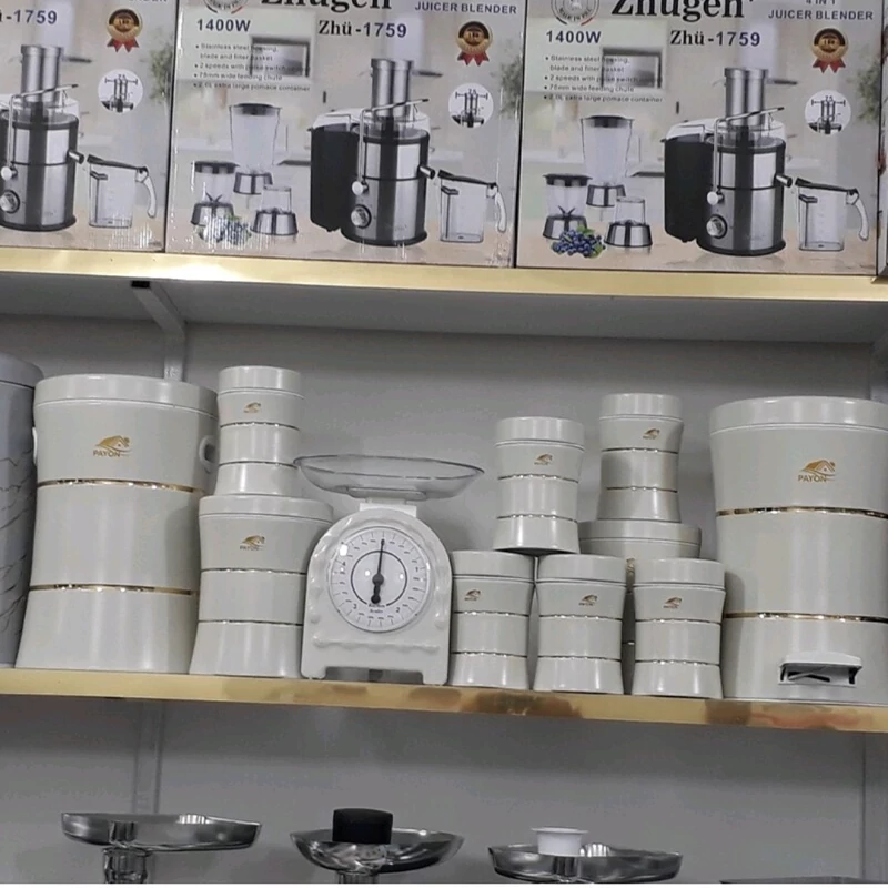 مشخصات ست ظرف نان و بنشن: - یک عدد ظرف نان - ابعاد ظرف نان: 17.5 × 24 × 43.5 سانتیمتر و وزن 1609 گرم - ظرف نان دارای درپوش آسان بازشو و مناسب برای نگهداری از انواع نان - 3 عدد بانکهها دارای درپوش از نوع چفتی - ابعاد هر بانکه: قطر 11.5، ارتفاع 16.5 سانتیمتر - وزن 375 گرم - کف بانکهها دارای لایهای لاستیکی برای جلوگیری از سُر خوردن از روی سطوح مختلف - بانکهها مناسب برای نگهداری از قهوه، شکر، چای، قند و... مشخصات بانکه کوچک: - تعداد: 3 عدد - ابعاد: قطر 11.5 و ارتفاع 9 سانتیمتر - وزن ظرف: 207 گرم - دارای درپوش فلزی مشخصات ظرف بانکه متوسط: - تعداد: 3 عدد - ابعاد: قطر 17.5 و ارتفاع 20 سانتیمتر - وزن: 715 گرم - دارای درپوش فلزی مشخصات ظرف حبوبات بزرگ: - تعداد: 1 عدد - ابعاد: قطر 27.5 و ارتفاع 23 سانتیمتر - وزن: 1515 گرم - دارای درپوش فلزی مشخصات ترازو: - ابعاد: قطر 22.5 و ارتفاع 30 سانتیمتر - قطر کاسهی ترازو: 22.5 سانتیمتر - وزن 650 گرم - دارای پیچ تنظیم عقربه (صفر کردن) - قابلیت جدا کردن کاسه - جنس ترکیبی از پلاستیک و فلز مشخصات ست ملاقه: دارای 6 عدد ابزار آشپزی به همراه استند - ارتفاع استند: 37.7 سانتیمتر - وزن: 443 گرم - جنس: پلاستیک مشخصات ست جای ادویه: - شامل 6 عدد جای ادویه - ارتفاع هر ظرف ادویه: 10.8 سانتیمتر - قطر دهانه: 5 سانتیمتر - وزن هر کدام: 90 گرم مشخصات ظرف برنج: - ارتفاع: 36.3 سانتیمتر - قطر سطح مقطع: 27.5 سانتیمتر - دارای قسمت جای دست - دارای پیمانه پلاستیکی - ظرفیت: 18 کیلوگرم مشخصات سطل: - ارتفاع: 42 سانتیمتر - قطر سطح مقطع: 29 سانتیمتر - دارای پدال - گنجایش: 20 لیتر - دارای دستگیره - دارای قابلیت جدا کردن سطل داخلی - دارای در فلزی مشخصات ظرف ماکارونی: - ارتفاع: 25 سانتیمتر - قطر: 11.5 سانتیمتر - وزن: 560